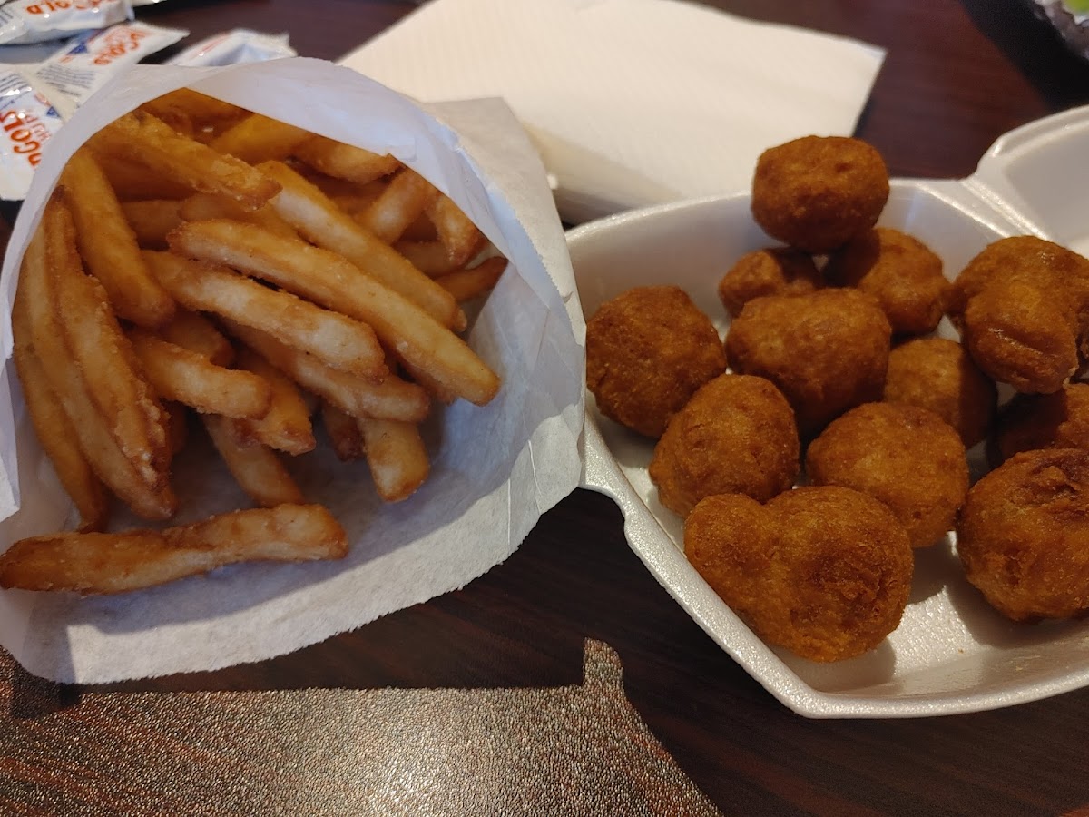 We had the fish broccoli and mash potatoes and chicken tenders potatoe salad and broccoli. It was fresh and delicious. We ate outside it was a beautiful place.